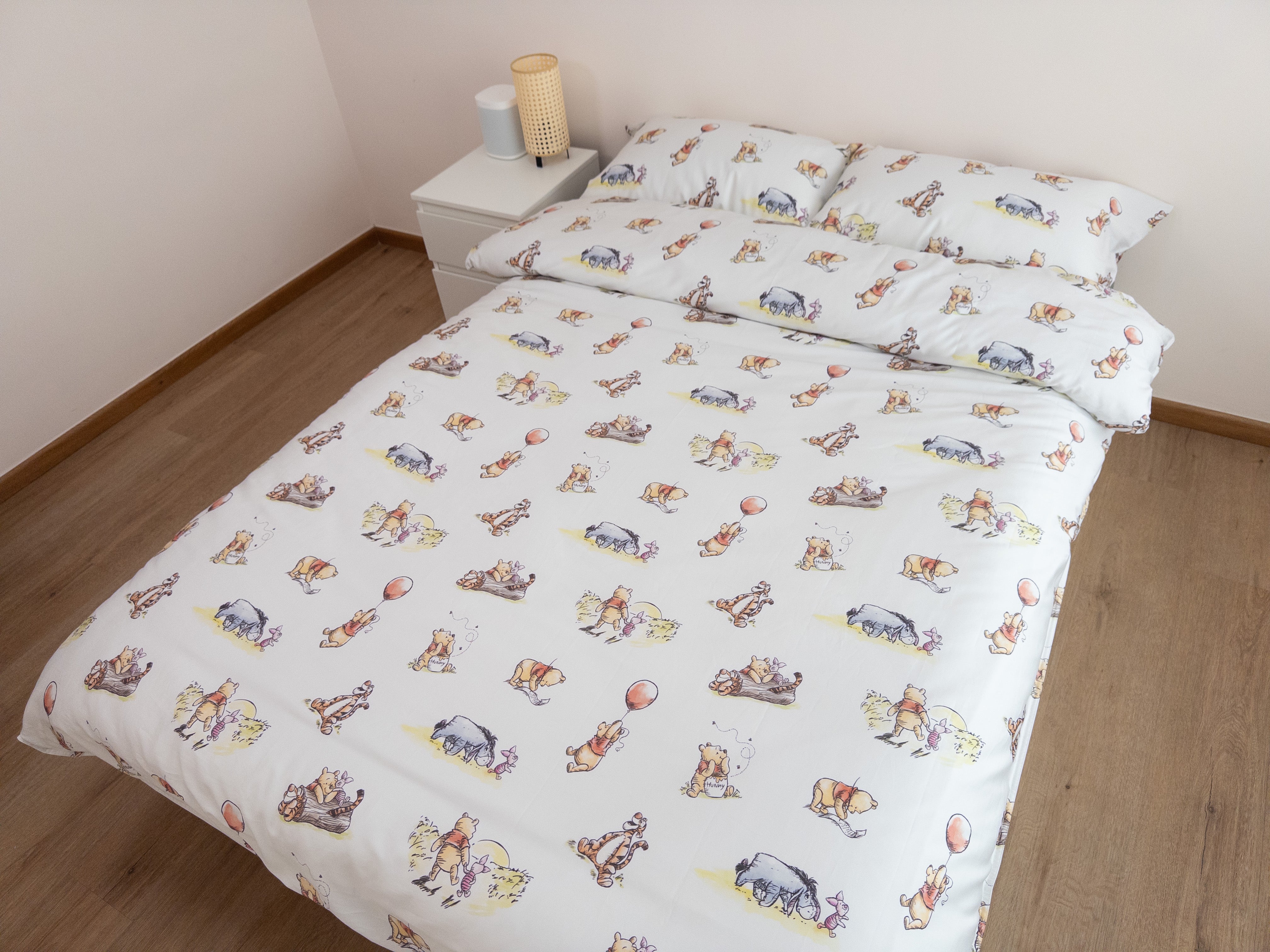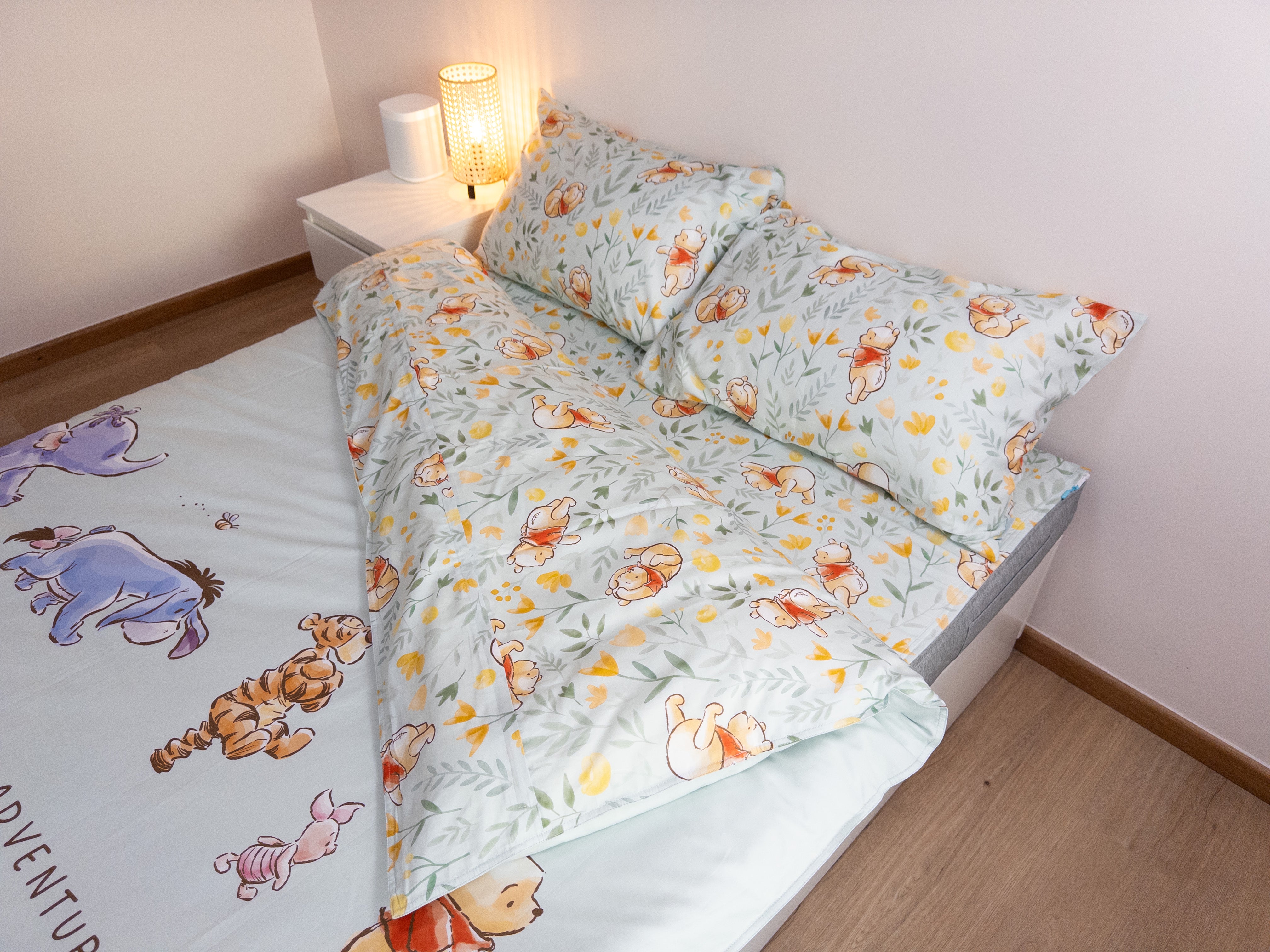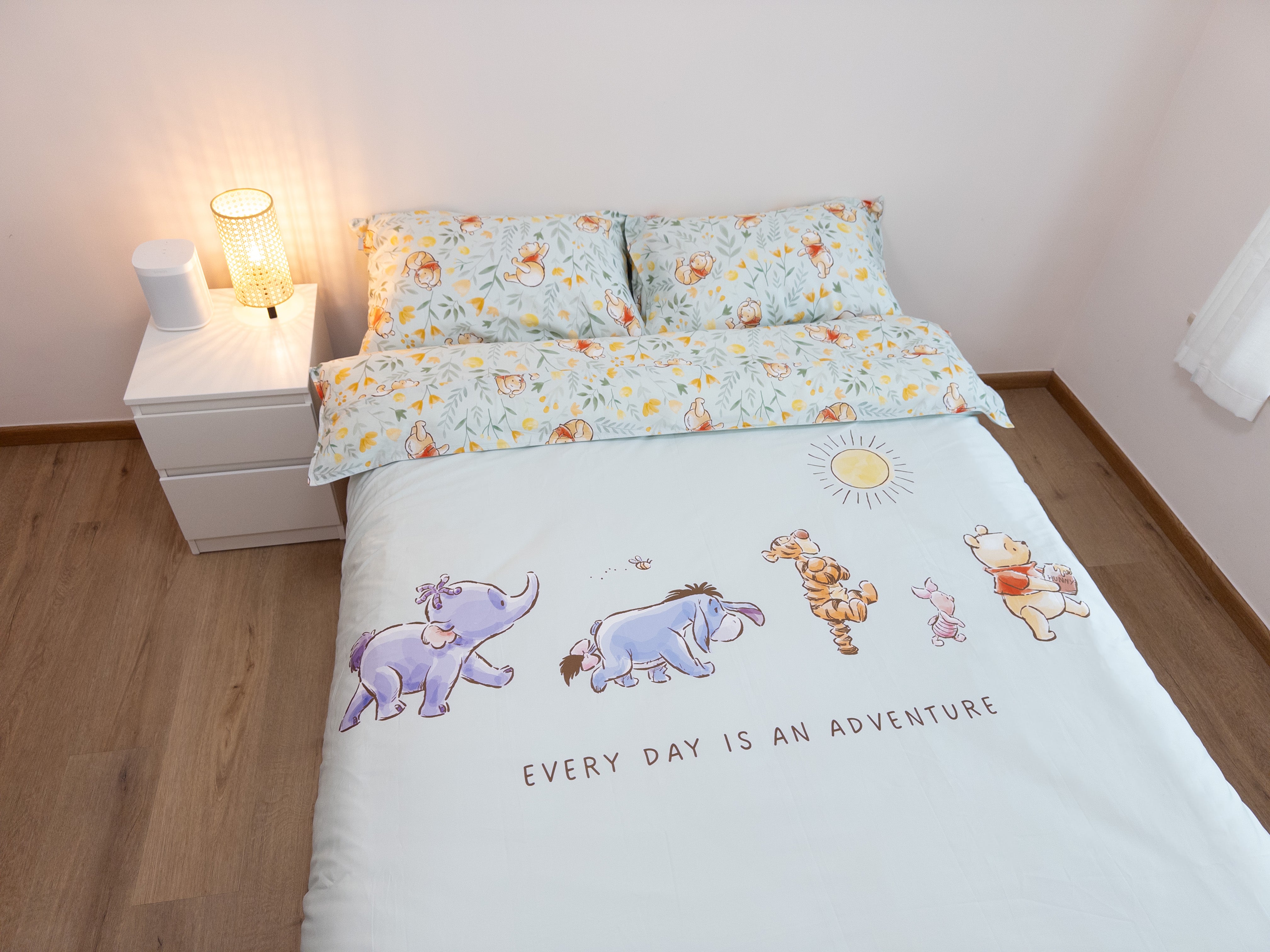 被袋方面,此款 Winnie the Pooh 被套也是採用我們的「Re Cover 新被袋」雙面開口設計,方便拆換,而款式上,則是和床單及枕頭套背面一樣,被袋雙面皆是使用同一碎花,和床單枕頭套襯成一套。