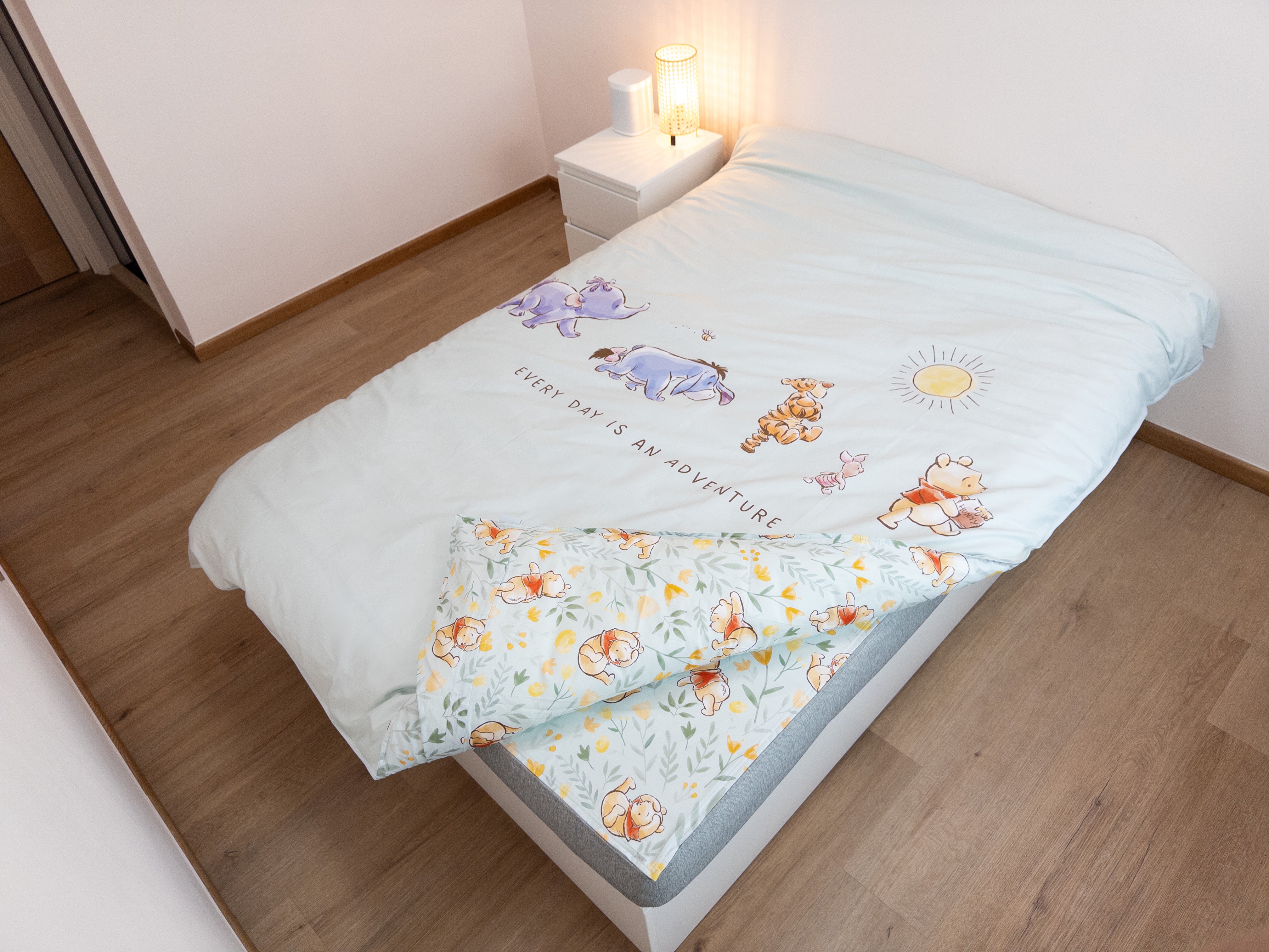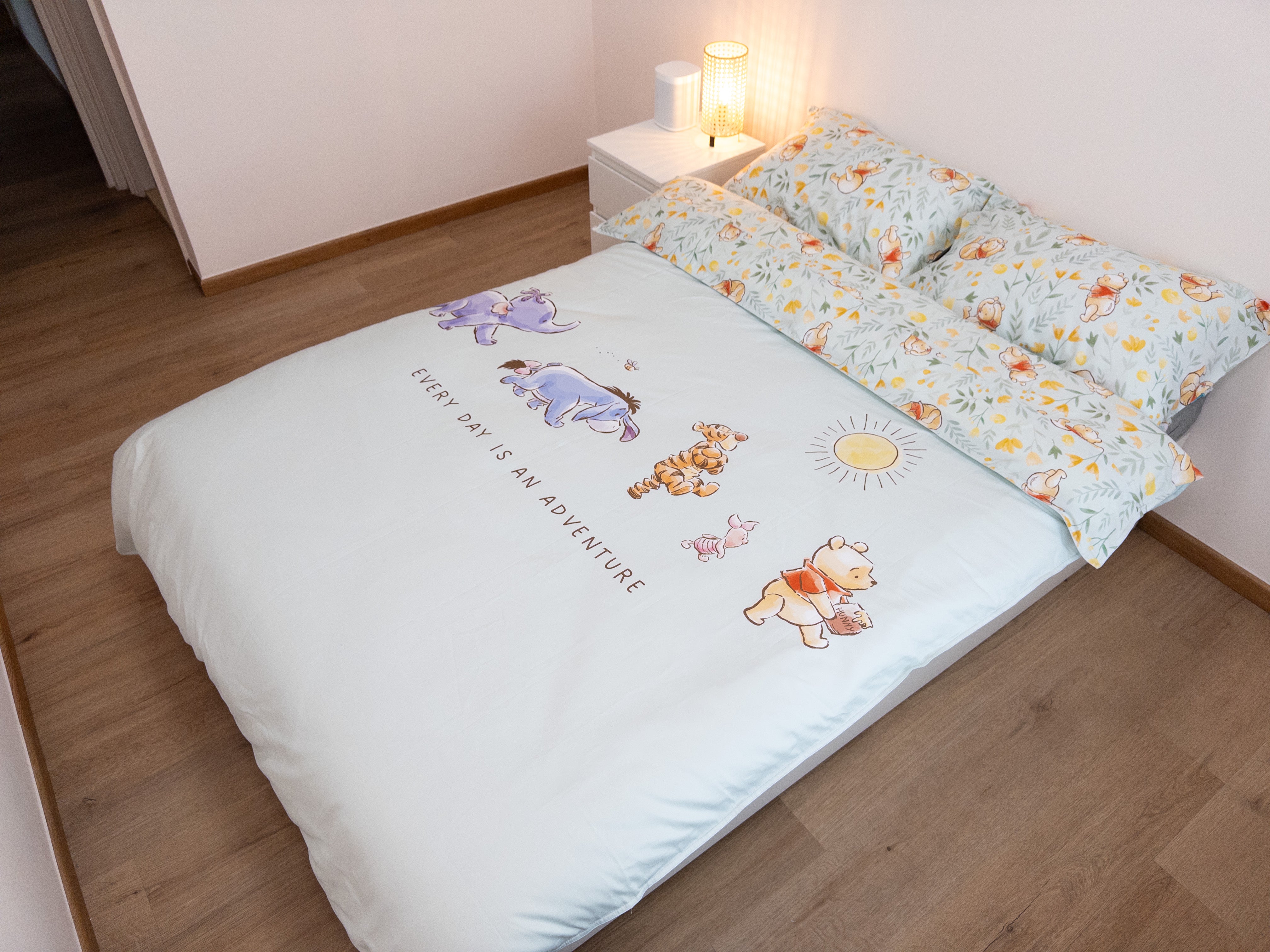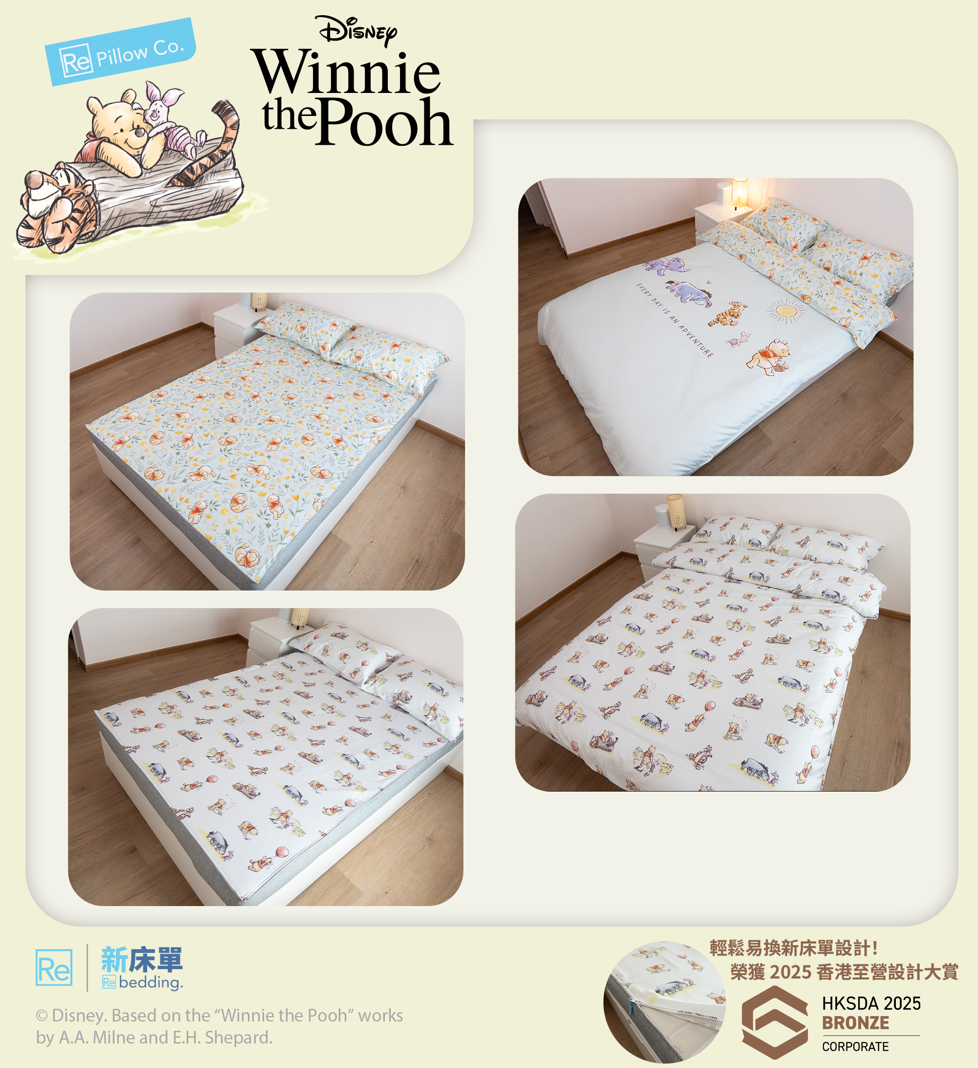 而當然,Winnie the Pooh 床單亦使用易拆易換的 Re Bedding 新床單設計,完美配合我們所有新床單底框使用,支援香港主流的十三種床褥尺寸。換床單,就像拉拉鍊般輕鬆。