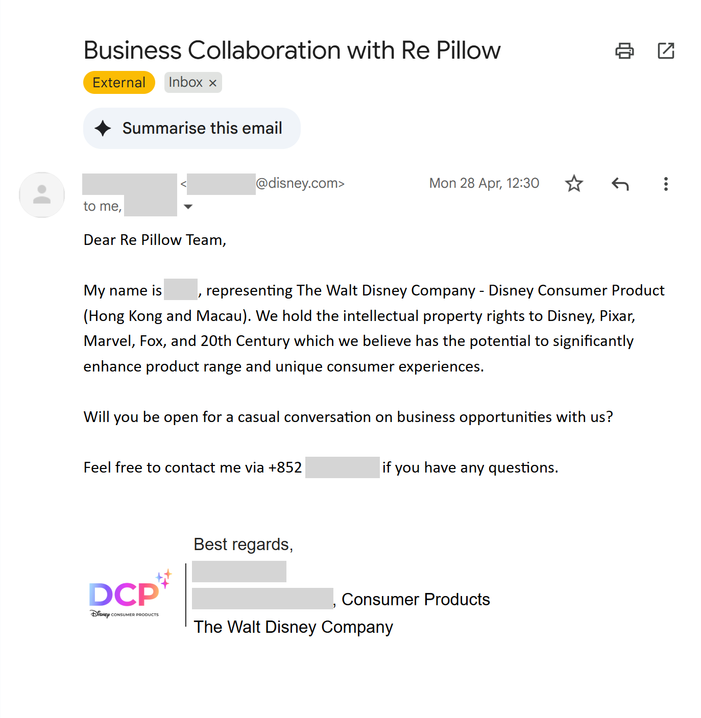 當日中午左右,突然收到了一個新電郵,電郵名為:Business Collaboration with Re Pillow,這一個電郵,改寫了我未來半年的產品計劃......